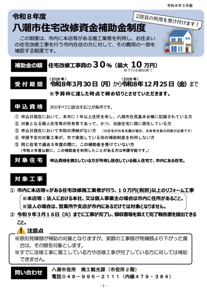 八潮市では、住宅の改修工事費の一部を補助する「八潮市住宅改修資金補助金」の受付が 令和8年3月30日から開始されます。