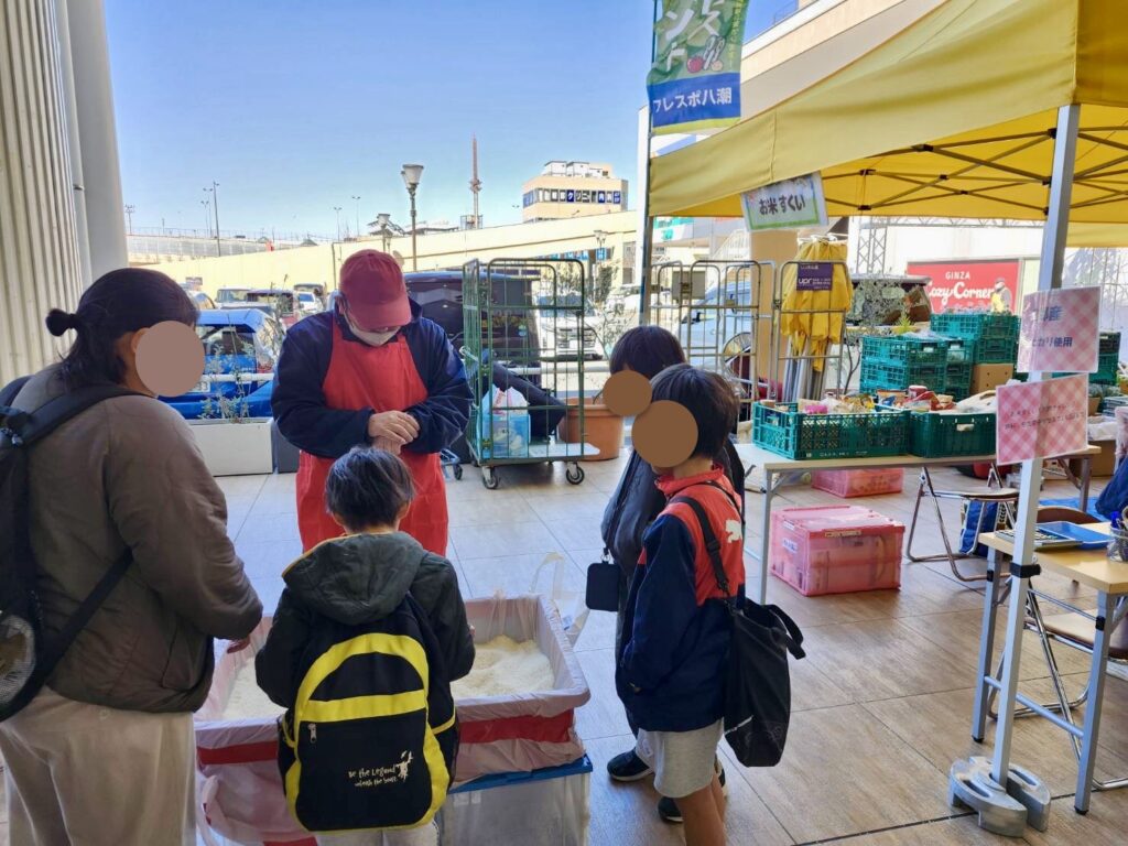 10秒間でどれだけお米をすくえるかチャレンジするゲームで、子どもたちも真剣な表情。親子で挑戦している姿も見られ、会場はとてもにぎやかでした。